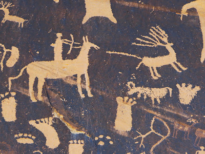 The Newspaper Rock is covered by hundreds of ancient Indian petroglyphs (rock carvings) - one of the largest, best preserved and easily accessed groups in the Southwest. The petroglyphs have a mixture of human, animal, material and abstract forms, and to date no-one has been able to fully interpret their meaning.